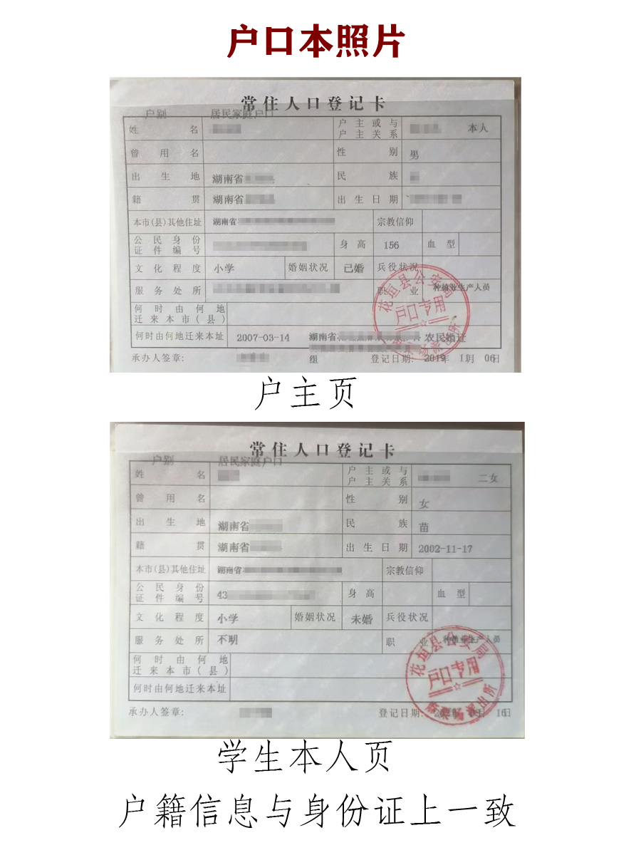 2、户口本照片,户主页和学生个人页,户籍信息必须与身份证一致