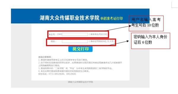 3、进入单招准考证打印页面,用户名输入考生号后10位,密码输入身份证号后6位,点击“提交打印”;