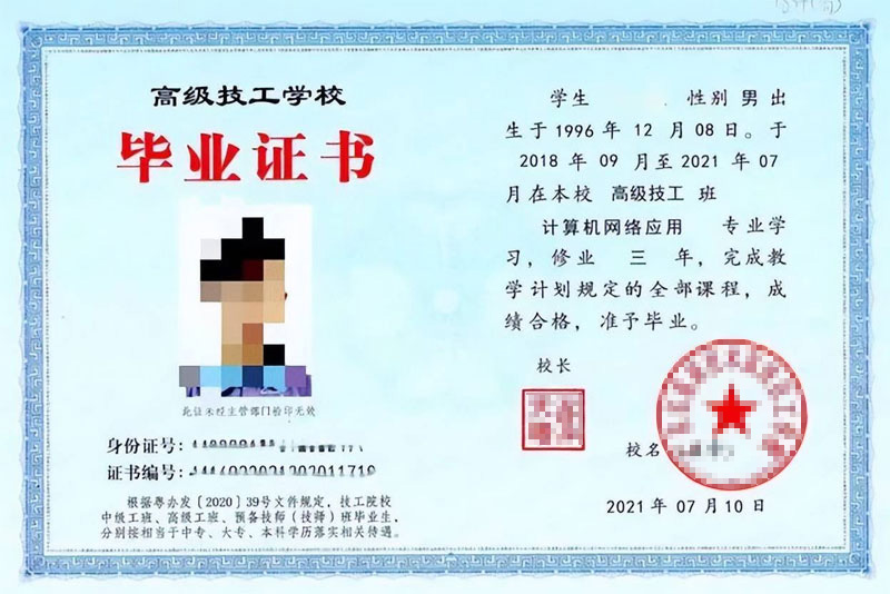 毕业证书:高级技工毕业证