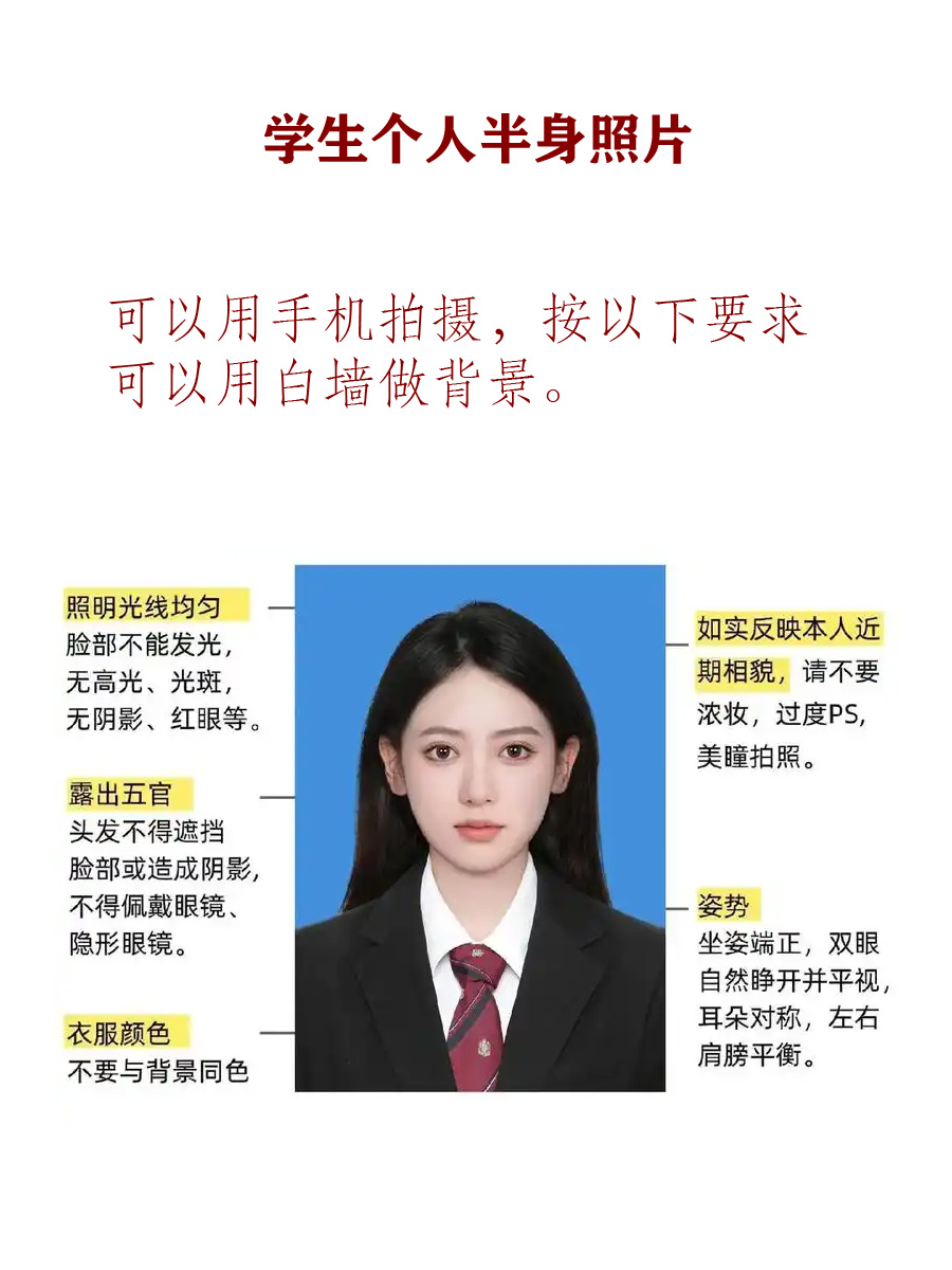 3、学生个人半身照,注意姿势端正,眼睛平视,眉毛不要被头发遮挡。
